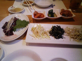 ナムル盛り合わせとキムチ盛り合わせ、そしてレバ刺し